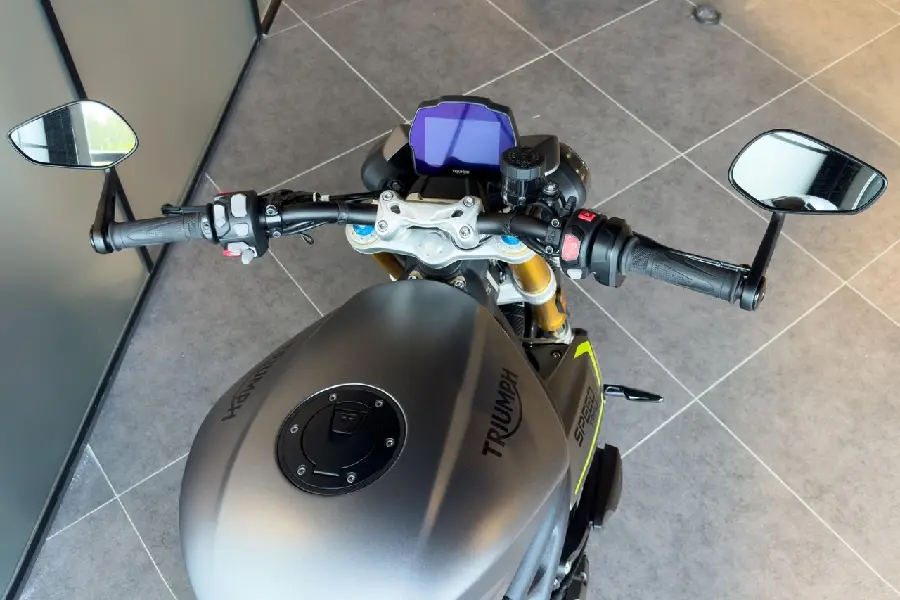 Triumph Speed Triple 1200 RS utrustad med bland annat kraschpuckar för motorn, front fork slider, tank pad, tailtidy, värmehandtag och CNC-frästa bar end mirrors.