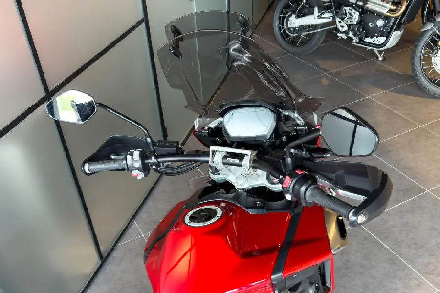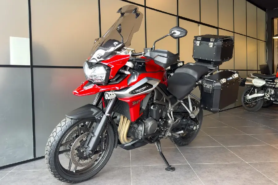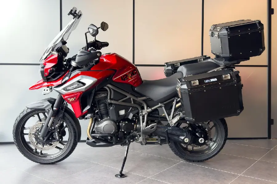 Triumph Tiger 1200 XRt utrustad med bland annat Arrow-slipon, 3 svarta väskor, centralstöd, nedre motorbågar, justerbar större tonad ruta med en extra vindavvisare, extraljus och handtagsvärmare.