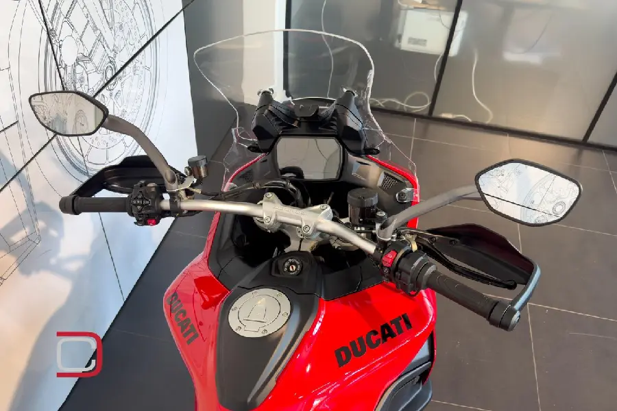Ducati Multistrada V2 S utrustad med bland annat värmehandtag, farthållare, elektronisk fjädring, quickshift och justerbara körlägen.