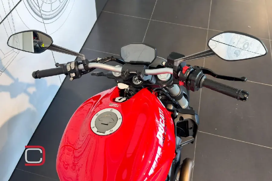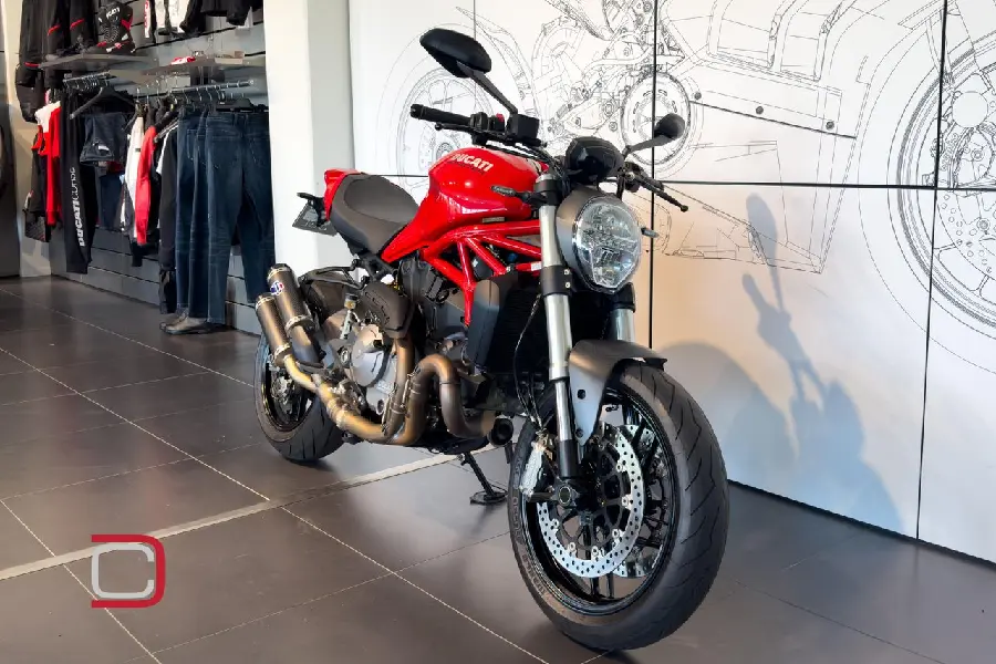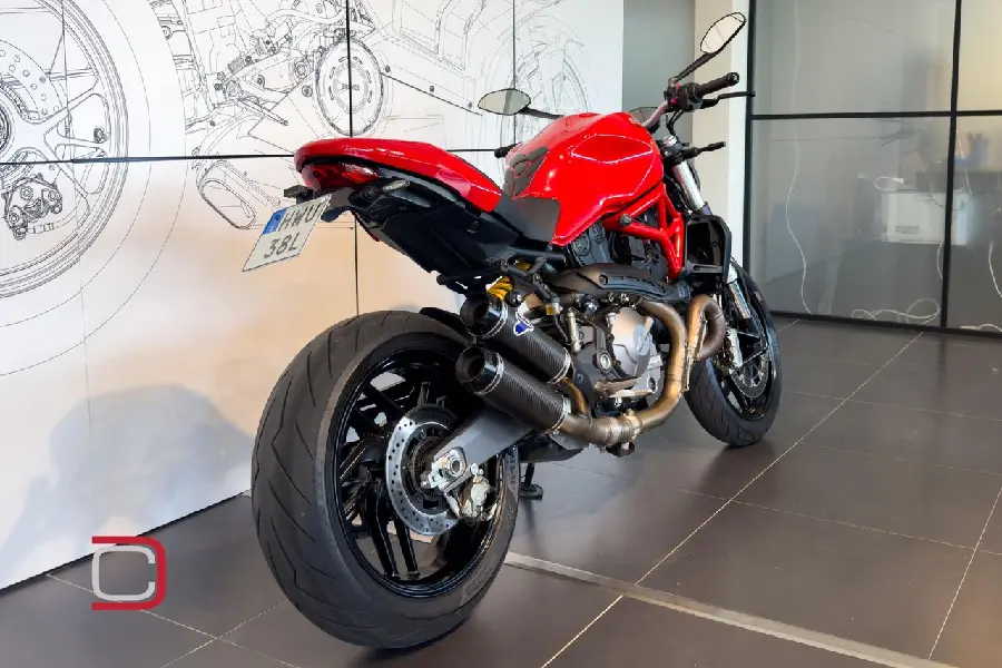 Ducati Monster 821 utrustad med bland annat Termignoni avgassystem, kolfiberstänkskärm fram, tailtidy, miniblinkers fram och bak från Ducati Performance och single seat.