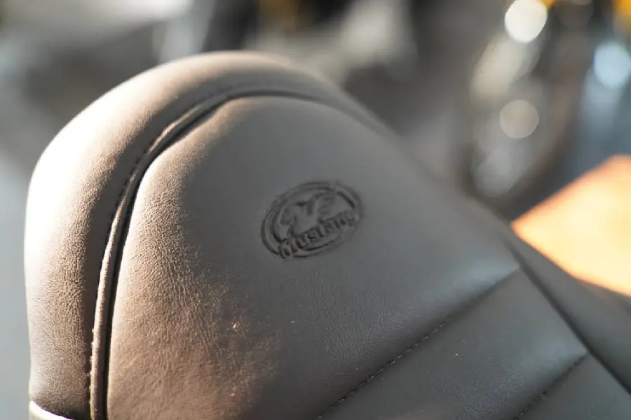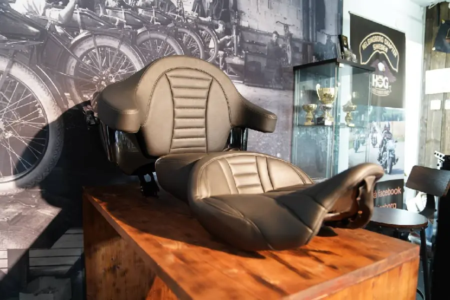 Ett riktigt fint tour-pack med Mustang-Sadel & Mustang Ryggstöd mot King Size Topp-Box i Vivid Black med snabbfäste.