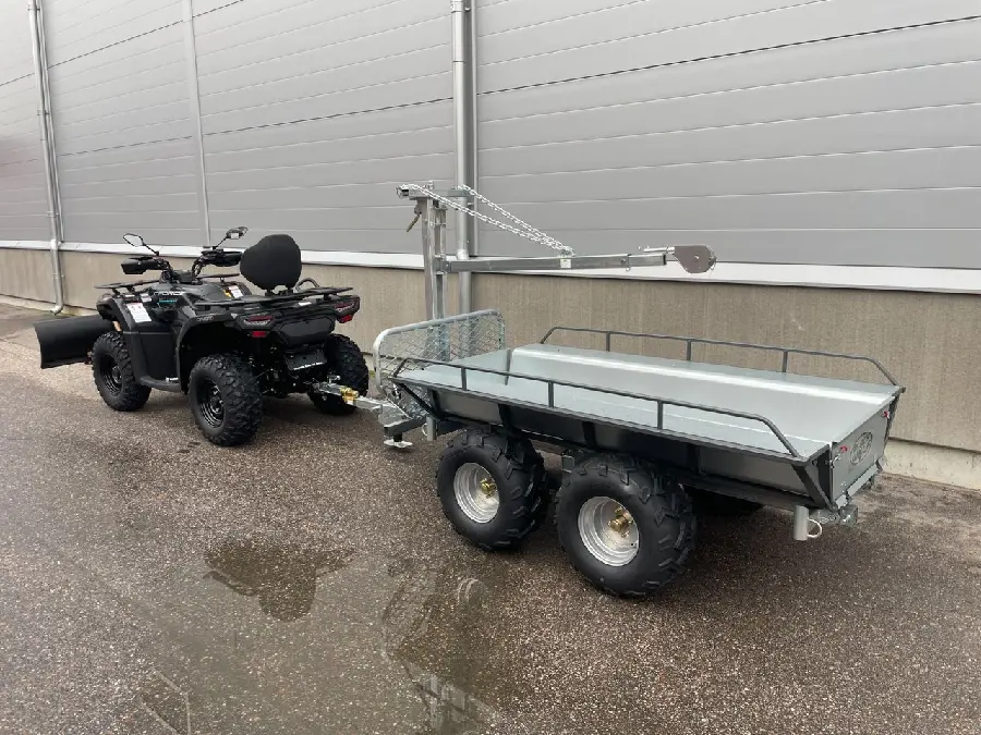 Nu har vi fått in nya CF-Moto cforce 450 med styrservo. Det här är marknadens kanske mest prisvärda kvalitetsmaskin. I Stora Gårdpaketet ingår en kraftig plog samt en kraftig Kombivagn med kran samt winsch och timmersax. (ej på bild). Allt monterat och klart!! Ta bort insatsflaket och du har en timmervagn. Priset avser terrängregistrerad fyrhjuling. +4000kr för Traktor A/B