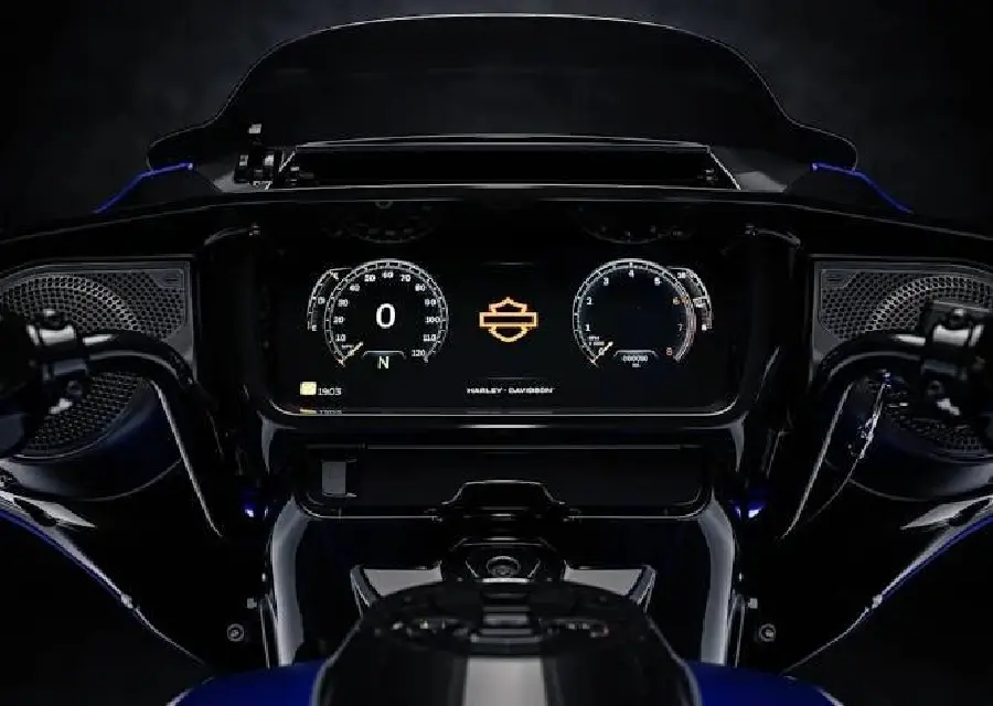 En ljusstark, handskvänlig färgpekskärm ersätter samtliga analoga mätare och de flesta reglage. Den samlar navigering, musik och motorcykeldata i en ren och lättanvänd layout.