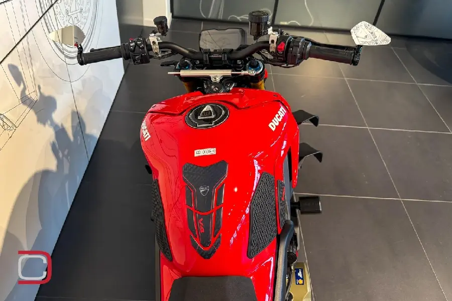 Ducati Streetfighter V4 S utrustad med bland annat Akrapovic helsystem med tillhörande mappning och grenrörsskydd i kolfiber, single seat, tailtidy från Rizoma, miniblinkers fram & bak från Rizoma, bar end mirrors från Moto Gadget, värmehandtag, kylarskyddsgaller från CNC racing, kraschpuckar från RG racing, front fork slider, knee pads och en tank pad.