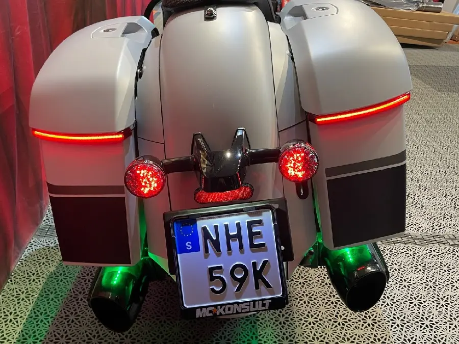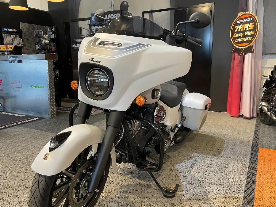 Nu säljer vi vår favorit-demo, Chieftain DH med den luftkylda Thunderstroke-motorn, så smidig på vägen att man får ett stort leende bakom visiret. Vi har utrustat den med högt styre samt snyggare grepp och handtag. Luft & buller samt med Lloydsmapp för bättre gång, och inte minst lite extra flärd i form av ljusramper i väskorna och grön neon.