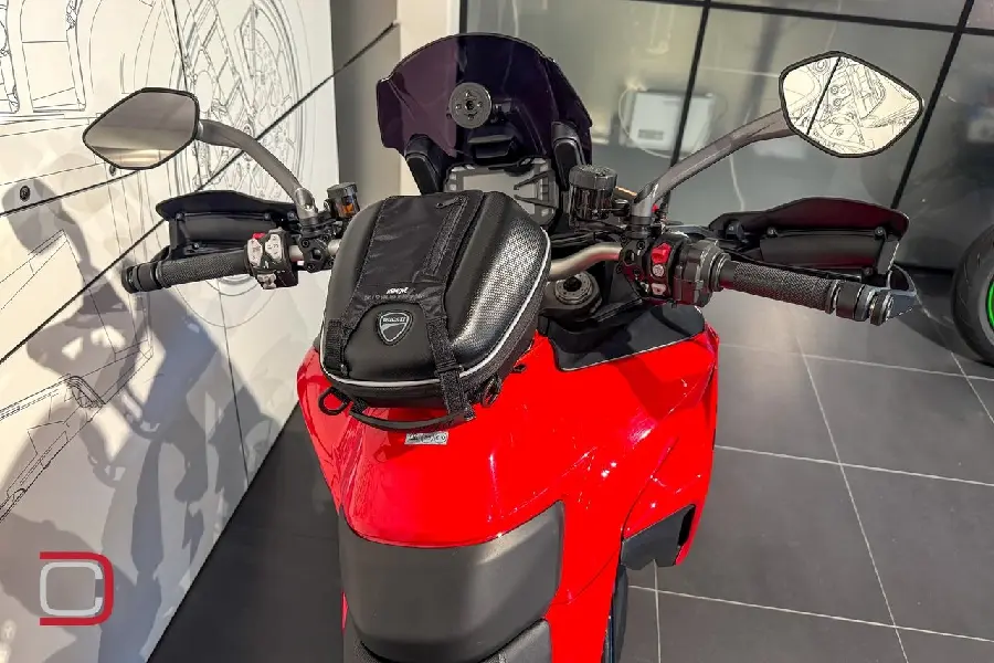Ducati Multistrada V2 S extrautrustad med Akrapovic avgassystem med grenrörsskydd i kolfiber, tankväska, tonad ruta, handguards, centralstöd, quickshift, farthållare, körlägen, elektronisk fjädring och telefon/GPS-fäste.