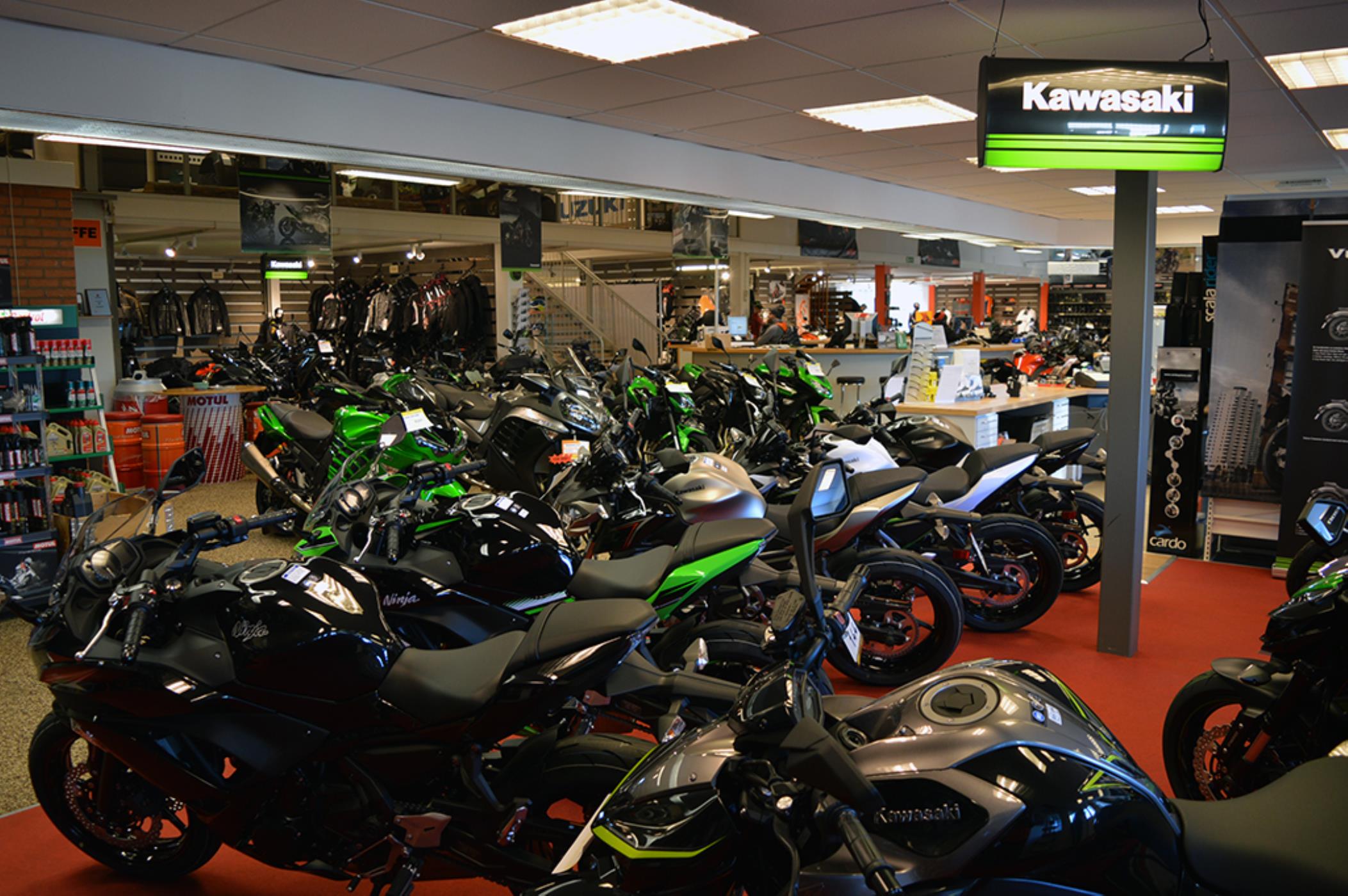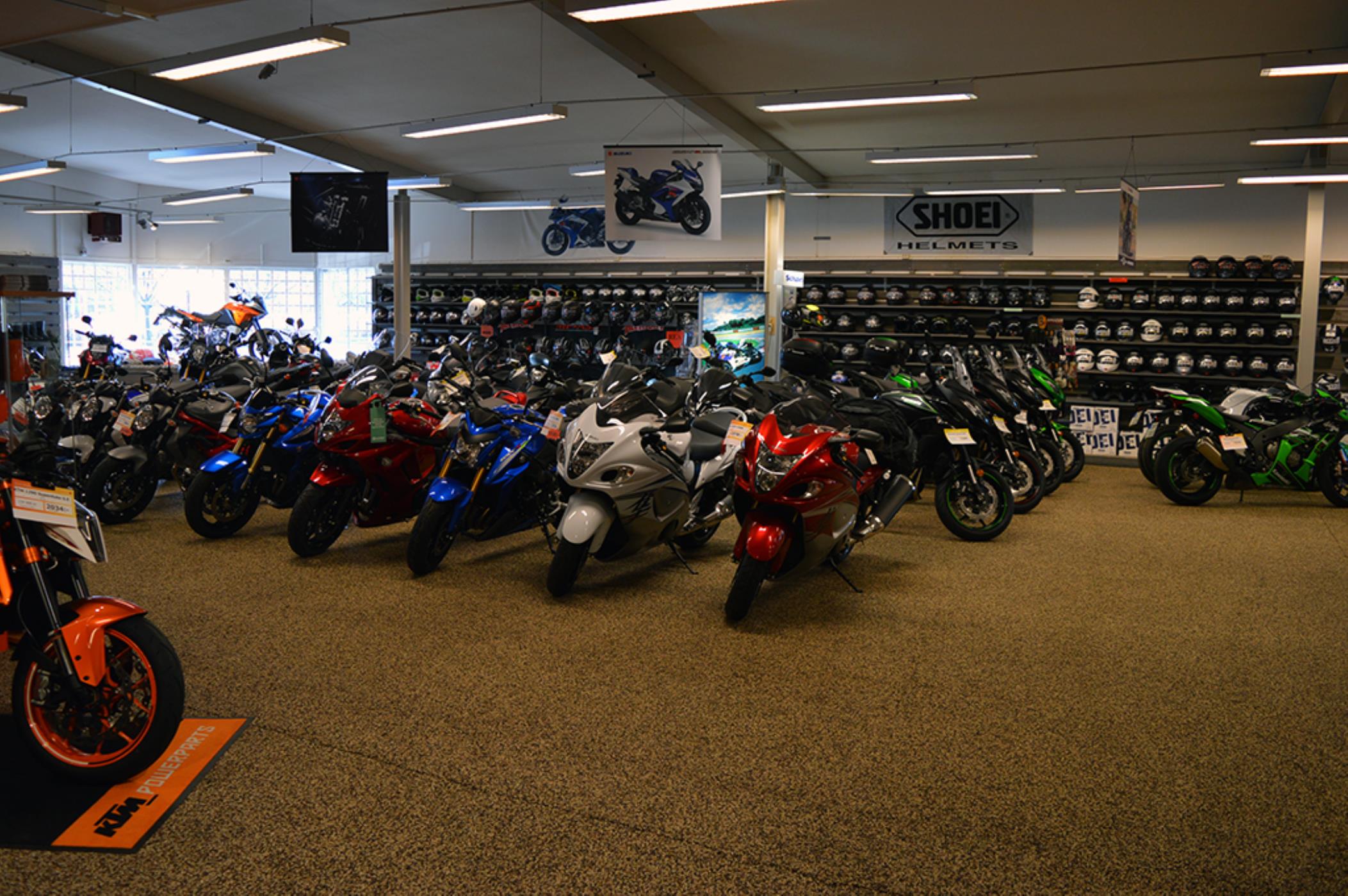 Vi är återförsäljare för Kawasaki, Suzuki & KTM. Våra nya hojar levereras körklara med alla garantier och en bra affär inkluderad. Vi har alltid nya modeller hemma för visning. Hos oss hittar du även en stor tillbehörsavdelning med kläder samt en auktoriserad verkstad. ETT AV SVERIGES STÖRSTA UTBUD PÅ KLÄ...DER & UTRUSTNING HITTAR DU I VÄRING!