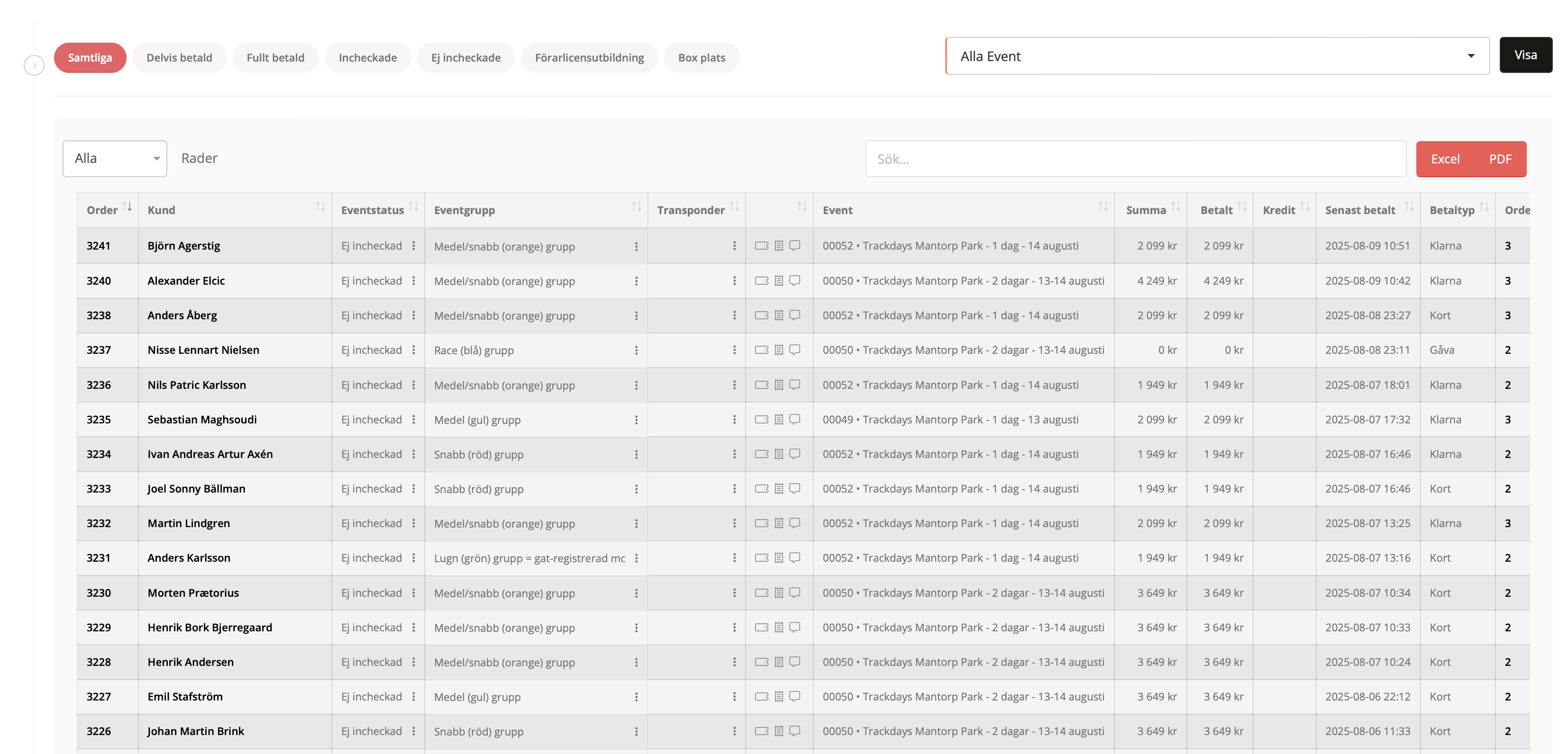 Du kan välja ikonenra överst som är samtliga, delvis betald, full betald och liknande. Dessa är genvägar som gör det snabbare för dig att se vilka som exempelvis inte checkat in. Du kan använda det i samband med att välja det event som avses i listan och sedan trycka på knappen "visa" för att se kundernas bokningar.