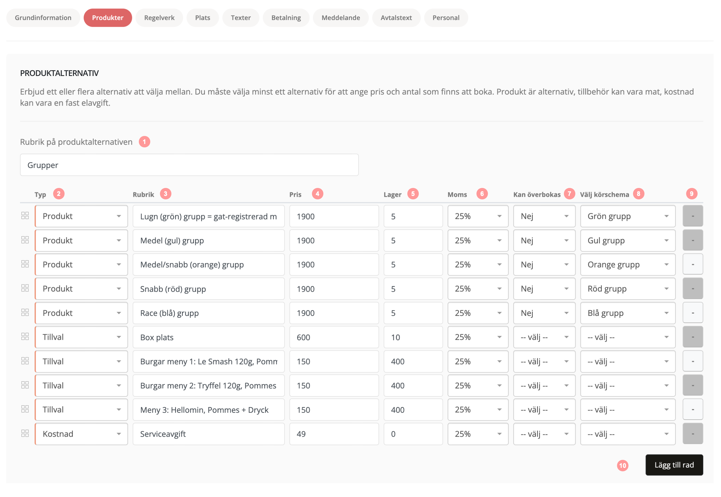 I sektionen produkter bygger du upp alla de val och alternativ som kan väljas på ett event.