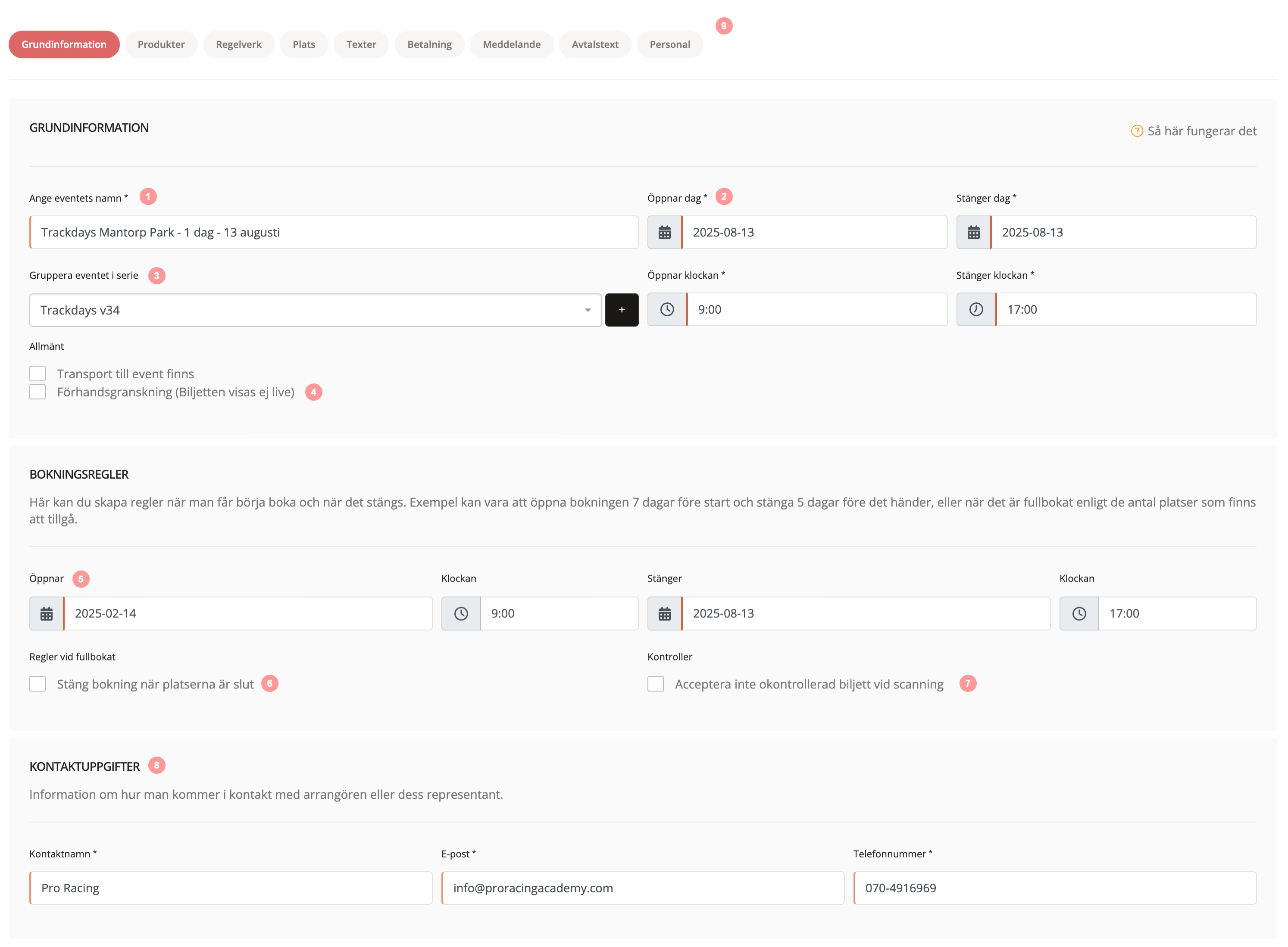 1. Varje event behöver ha ett tydligt namn för att kunden skall kunna förstå vad de har bokat. Namnet förekommer på flera ställen, på biljetten, vid beställning, på kvitto och administrationssidor. Tänk på att inte ha för lång text