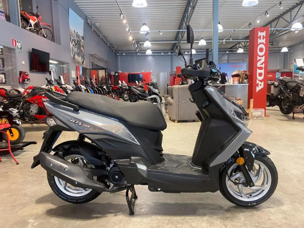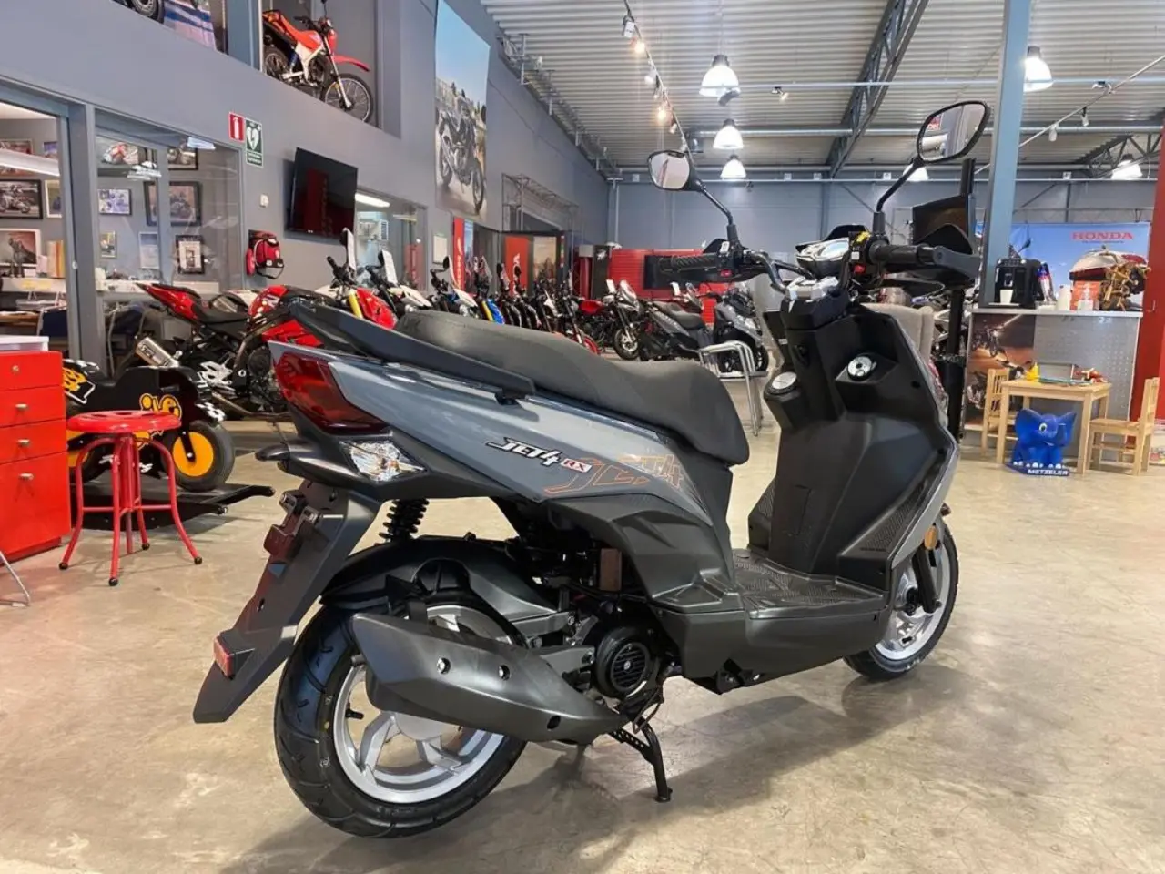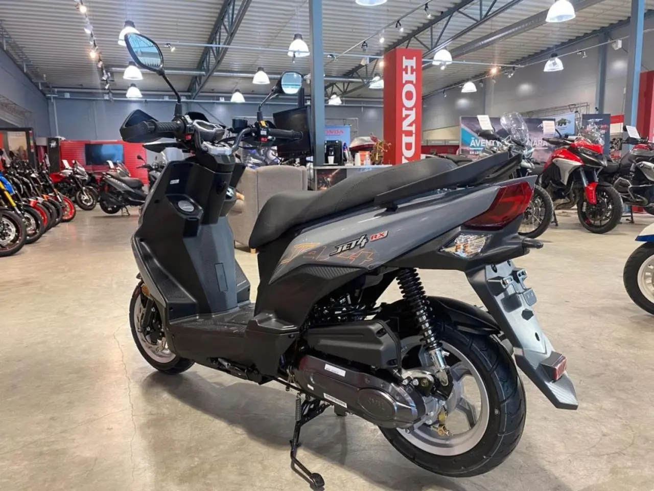 Den sportiga designen i kombination med den unika LED strålkastaren gör Jet 4RX till en omtalad sportscooter, italiensk design när den är som bäst. Stabila köregenskaper. 4-taktsmotorn med direktinsprutning gör den stark och bränslesnål. Förvaringsutrymme under sadeln och även USB uttag för laddning av telefon. Det attraktiva priset gör att du får marknadens bästa sportscoo­ter och mycket valuta för pengarna.