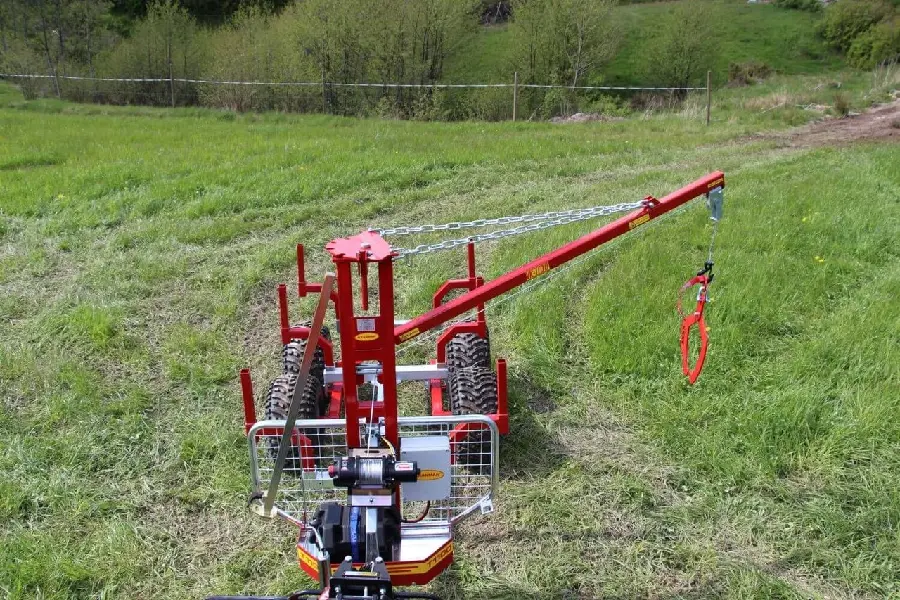 Utrustad med vagn, kran, fjärrstyrd elvinsch, ett stödben, timmersax och batterilåda.