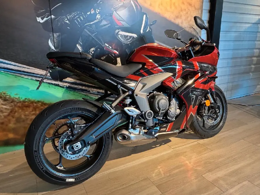 Nu har du chansen köpa denna unika Daytona 660 i färgen CARNIVAL RED / SAPPHIRE BLACK med ett dekalkit från SKDA med SUPERDEAL ! En ren körglädje från start utrustad med Traction Control - Ride Command - ABS - TFT-display - Tre körlägen - Justerbar dämpare bak - Upside downgaffel - LED Strålkastare - Alufälgar - Slip & Assist Clutch.