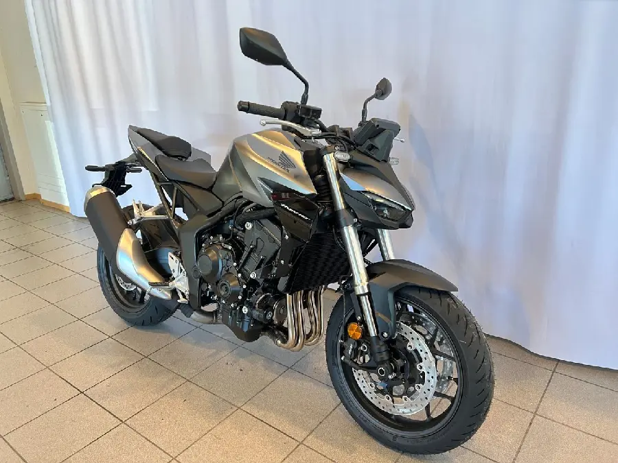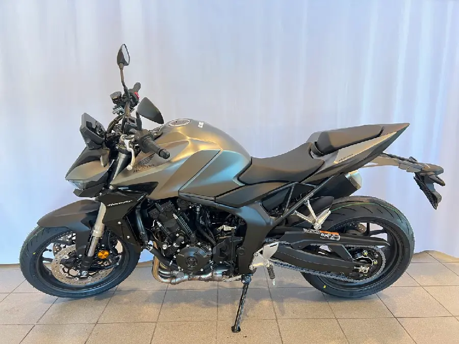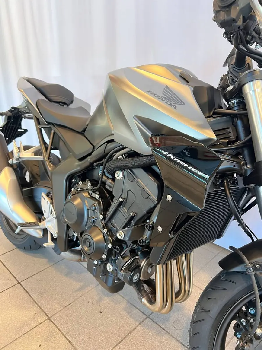 Nu släpper Honda äntligen sin vassaste Hornet hittills, ett omtalat och efterlängtat kraftpaket som garanterar underhållning på hög nivå. CB1000 Hornet har ärvt den mäktiga Fireblade-motorn och ett avancerat elektronikpaket med tre körlägen med förinställda nivåer av effekt, motorbroms, antispinn och Wheelie Control, plus två ställbara körlägen där man väljer nivåerna själv. Den 6-växlade lådan har assisterande slirkoppling och utväxlingar anpassade för optimal acceleration. Fjädringen hanteras av kvalitetskomponenter från Showa, med en inverterad 41 mm SFF-BP-gaffel fram och enkeldämpare med Pro-Link bak. Den kraftfulla frambromsen består av två radialmonterade fyrkolvsok som greppar varsin 310 mm flytande skiva. Framändan domineras av dubbla LED-strålkastare, annars är den kaxigt avskalad som sig bör på en streetfighter. Mitt i förarens blickfång sitter en lättavläst 5-tums TFT-färgskärm.