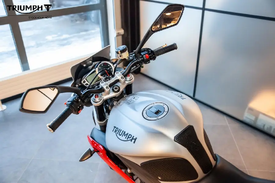 Triumph Street Triple RX utrustad med bland annat Arrow-slipon, single seat, ABS, quickshift upp, knee pads, tank pad och en fly screen.